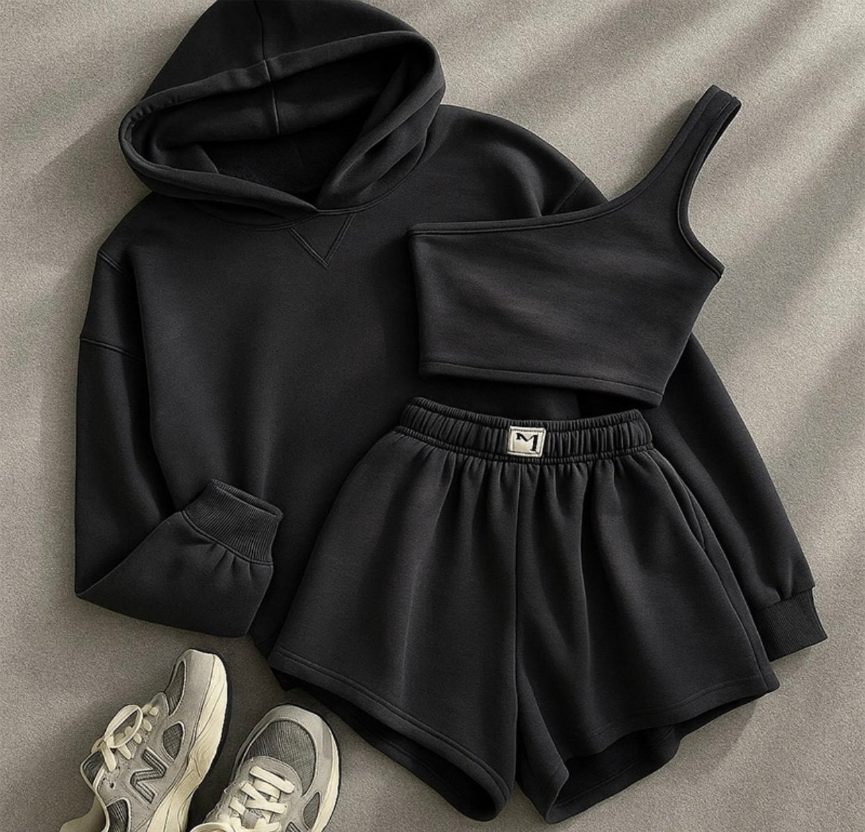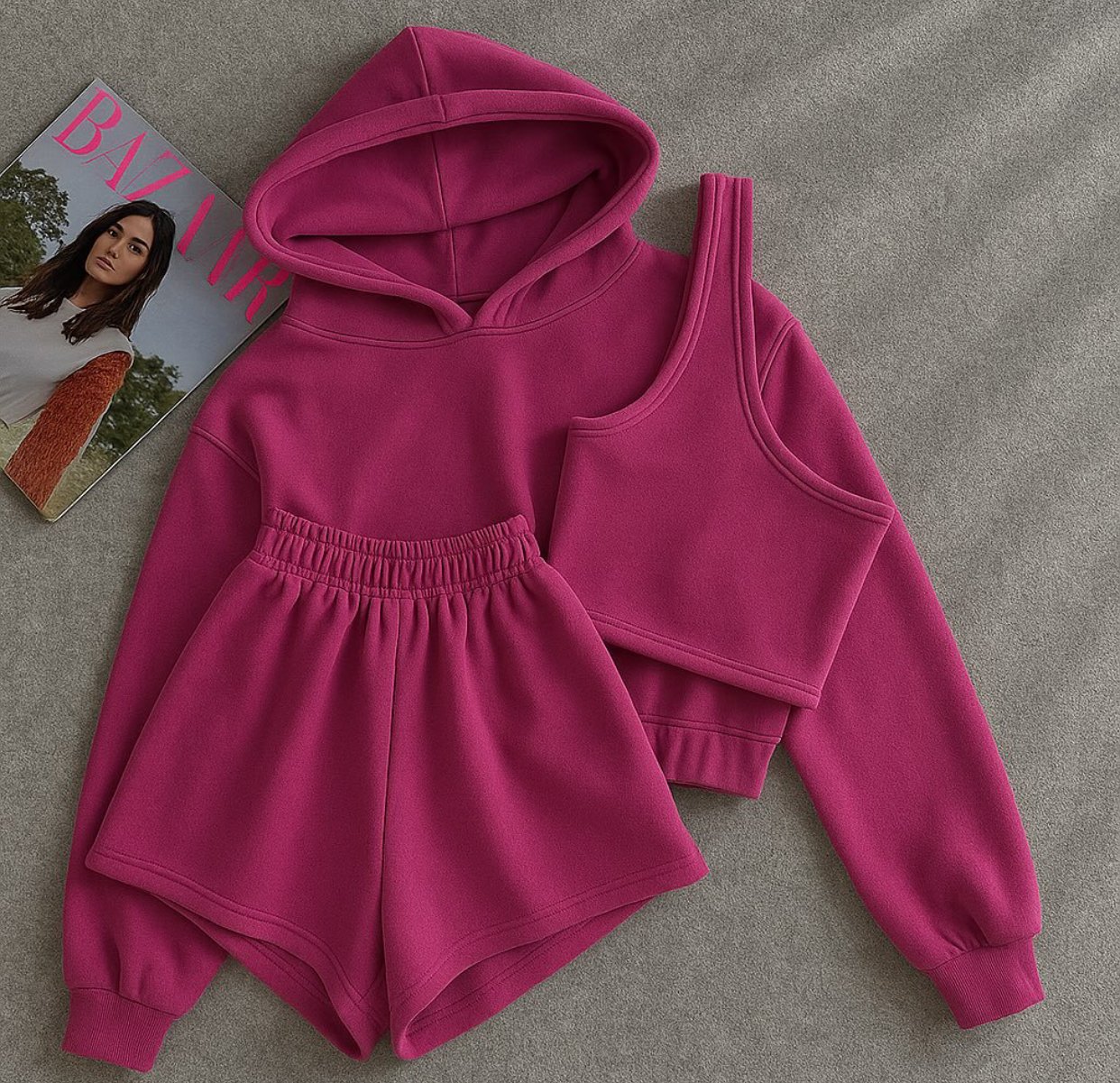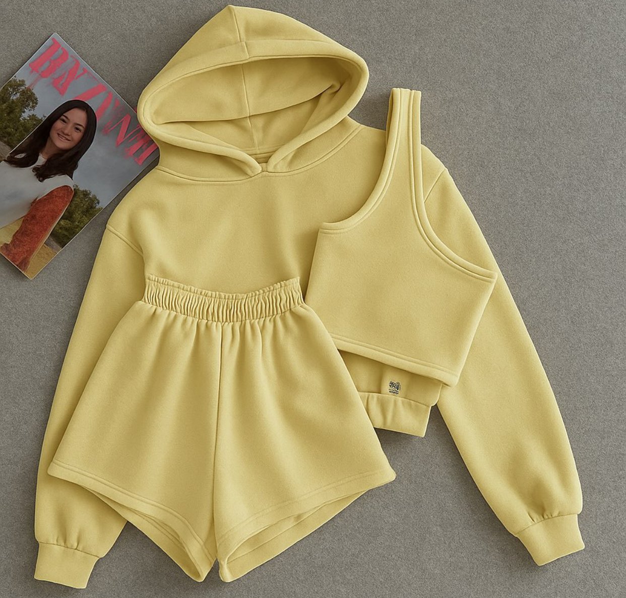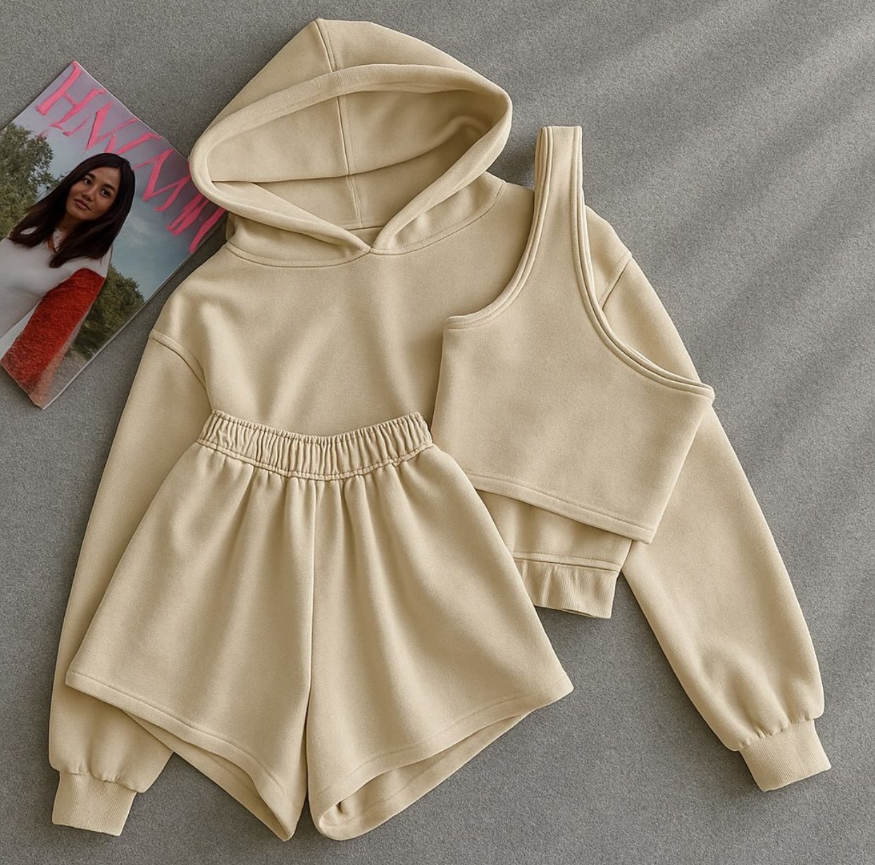 Conjunto moderno y cómodo que incluye hoodie, top y short de tiro alto